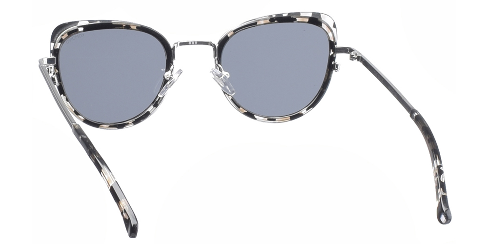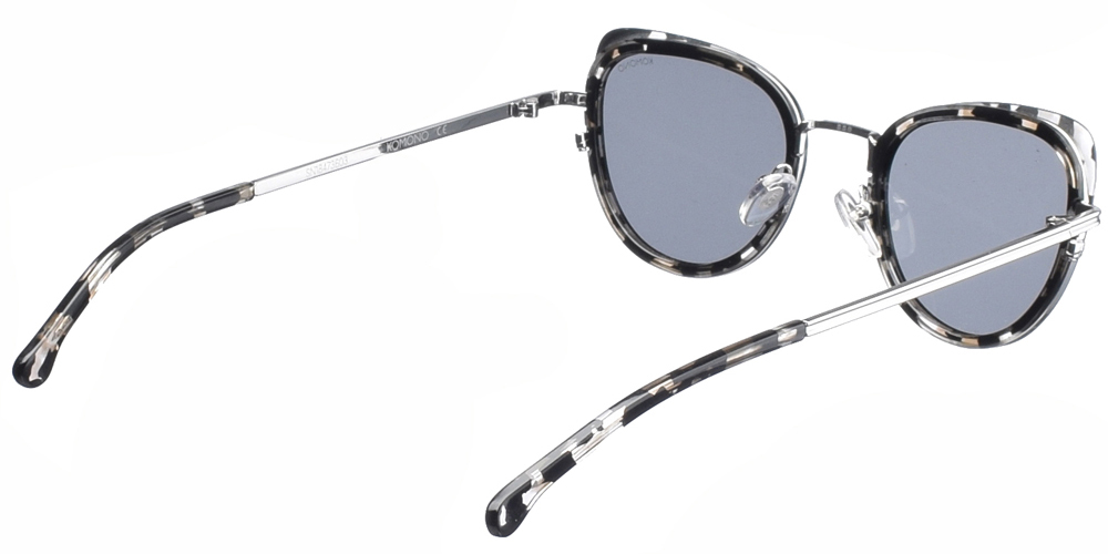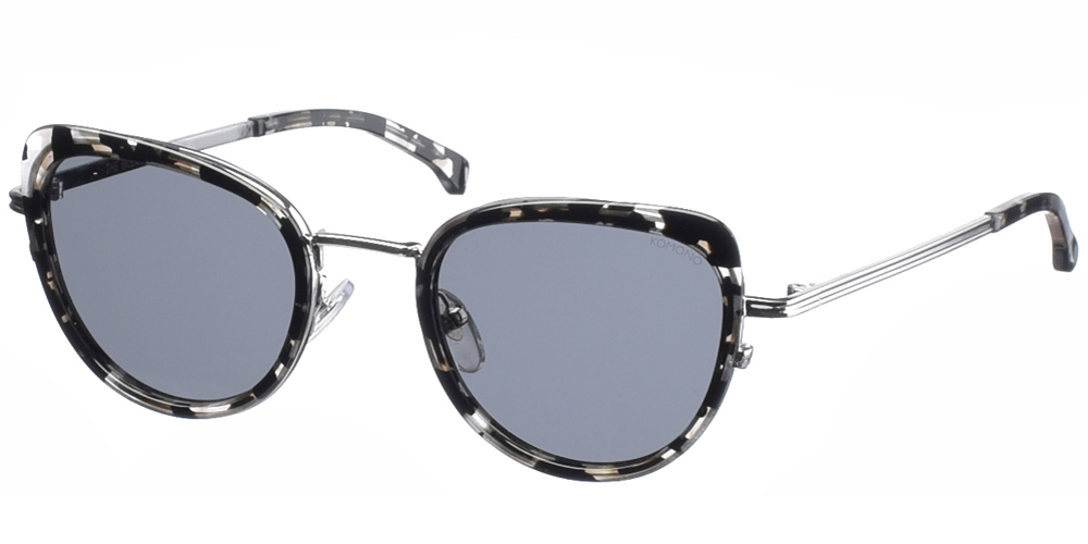 Γυναικεία γυαλιά ηλίου Billie σε σχήμα πεταλούδα σε ασπρόμαυρη ταρταρούγα με ασημί μεταλλικό σκελετό και polarized σκούρους γκρι φακούς της εταιρίας Komono για μικρά και μεσαία πρόσωπα.