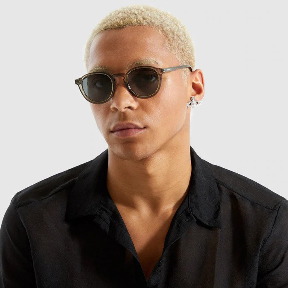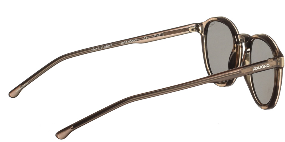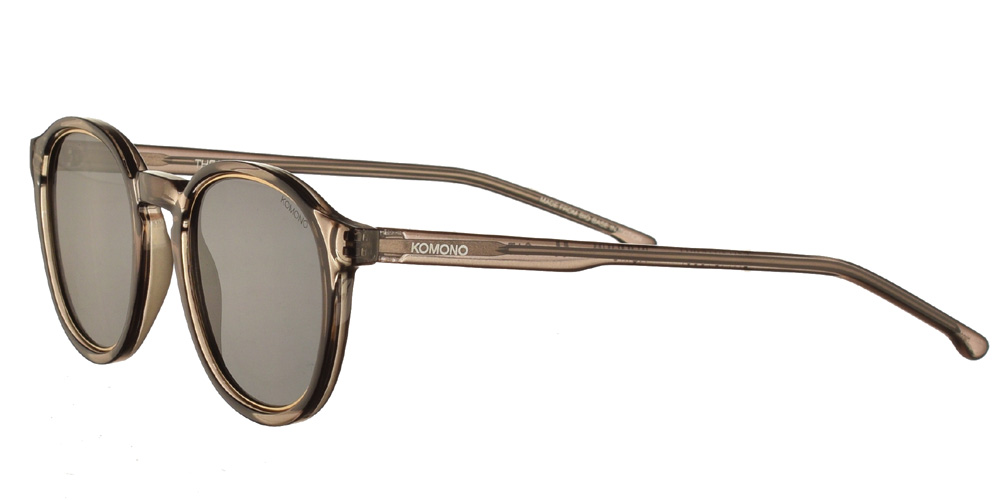 Κοκάλινα ανδρικά και γυναικεία στρογγυλά γυαλιά ηλίου Liam Musk Silver Rim διάφανα γκρί με μεταλλικό περίγραμμα και σκούρους γκρι φακούς της εταιρίας Komono κατάλληλα για όλα τα πρόσωπα.